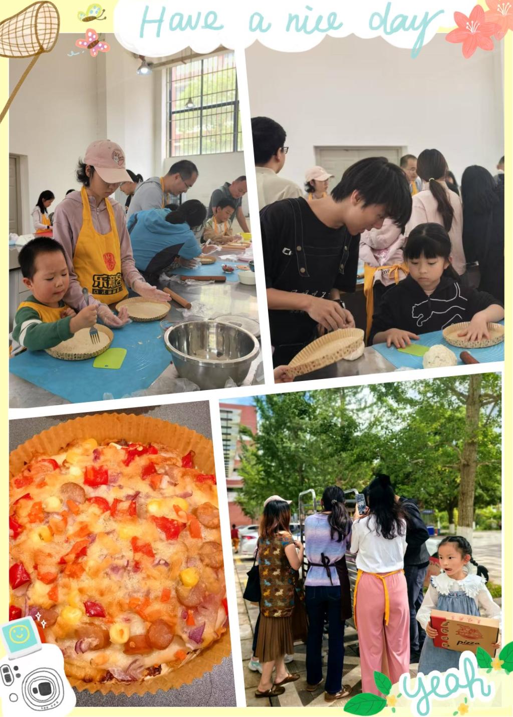 制作披萨。孩子们与父母携手完成披萨的制作,在协作中增进感情。披萨品种丰富多样,有培根披萨、烤肠披萨、肉多多披萨。